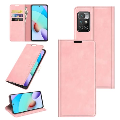 Para Xiaomi Redmi 10 Funda de Cuero Magnética de Succión Magnética de Negocios Retro-Piel con Soporte y Tragamonedas y Billetera (Rosa)