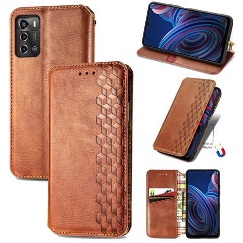 Caja de Teléfono para ZTE Blade A72 4G Cuero Magnético Prensado Rejilla Cúbica (Marrón)