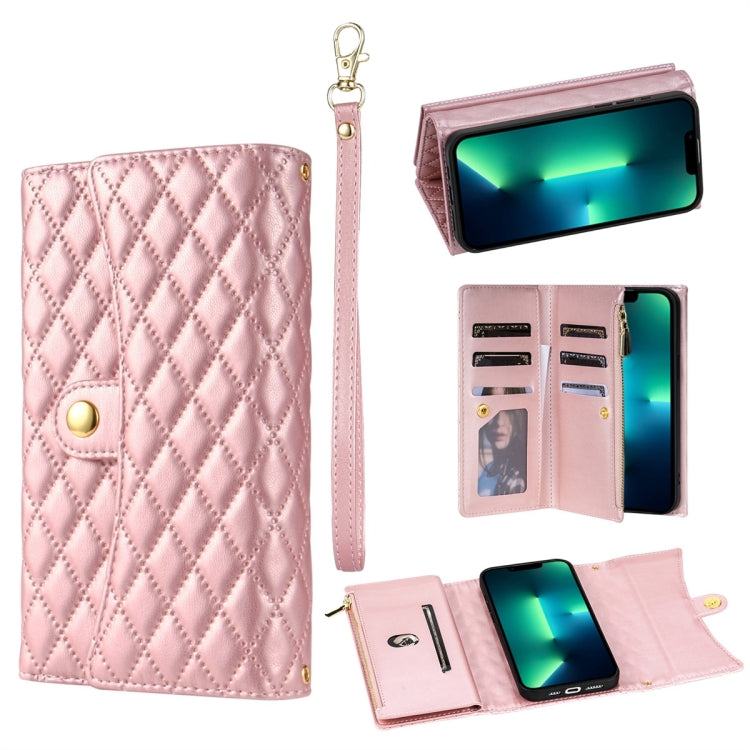 Funda para Teléfono iPhone 13 Pro Cuero Rómbico Billetera MultiTarjeta con Cremallera (Oro Rosa)