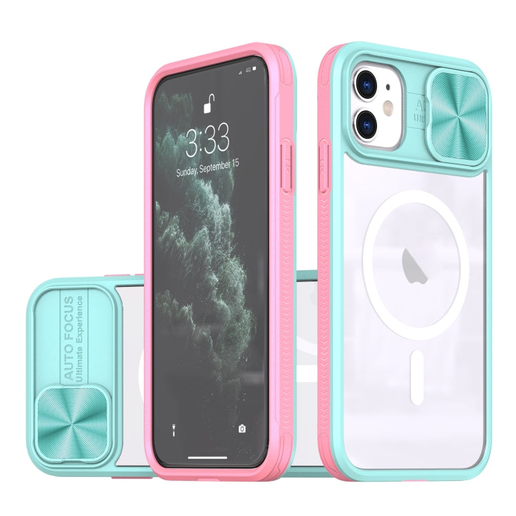 Funda para iPhone 11 con Cubierta Deslizante Acrílico Transparente PC TPU Magsafe (Rosa + Cian)