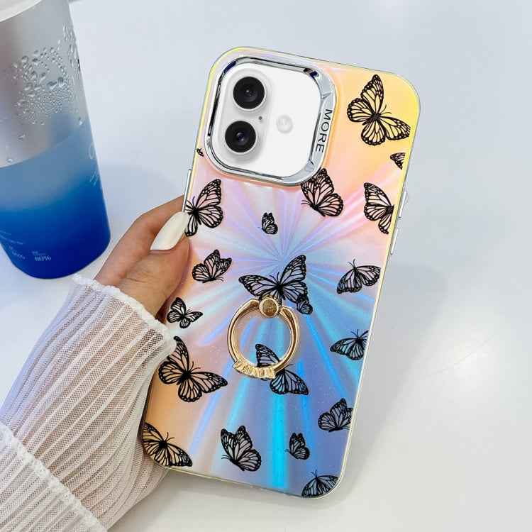 Estuche para Teléfono iPhone 16 con Soporte para Anillo Mariposa Láser Galvanoplastia (Negro)