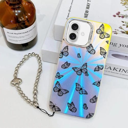 Funda para Teléfono iPhone 16 con Mariposa Láser Galvanizada y Correa para Muñeca (Mariposas de Color)