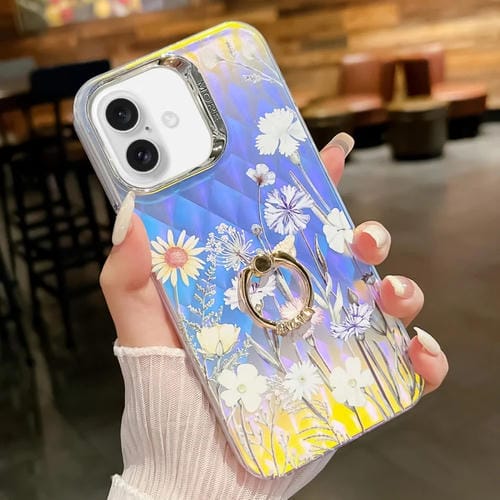 Funda TPU con Soporte para Anillo de Flores Láser Galvanizado iPhone 16 Plus (Crisantemo Ah5)