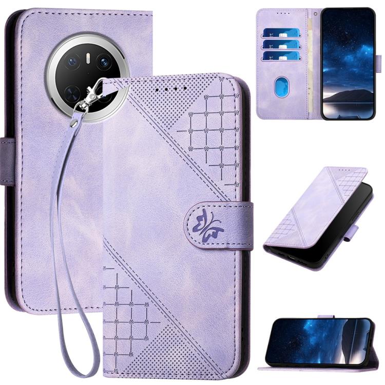 Funda de Cuero Huawei Mate 70 con Diseño Mariposa en Relieve y Cordón (Morado Claro)