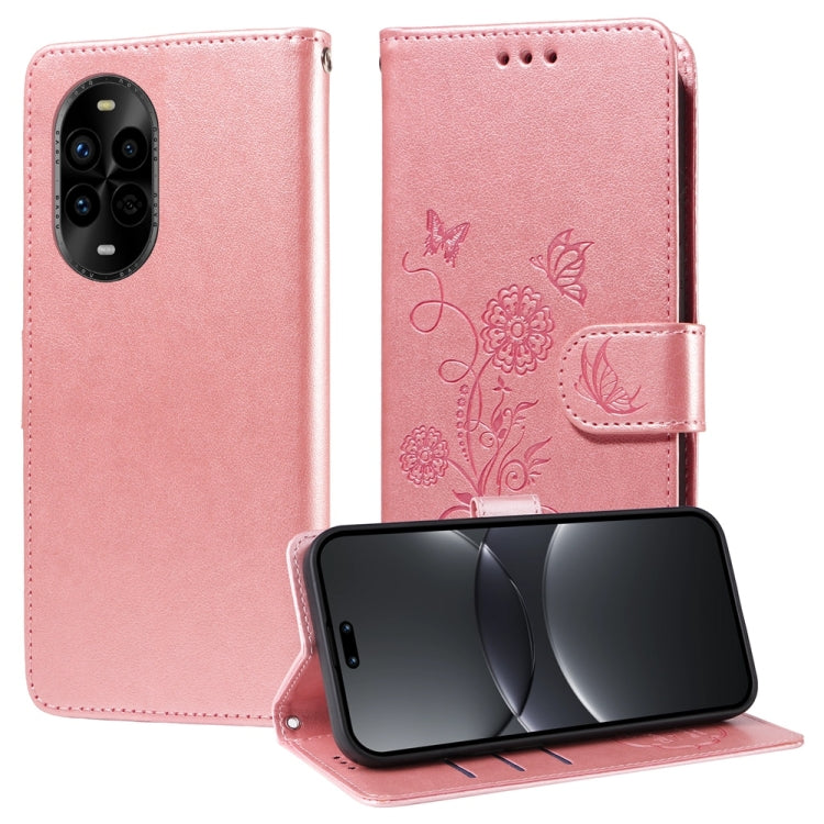 Funda de Cuero Huawei Nova 13 Pro con Diseño de Mariposas y Flores en Relieve (Oro Rosa)