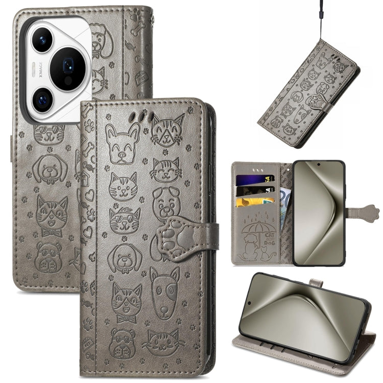 Funda para Huawei Pura 70 Pro de Cuero con Relieve de Perro y Gato (Gris)