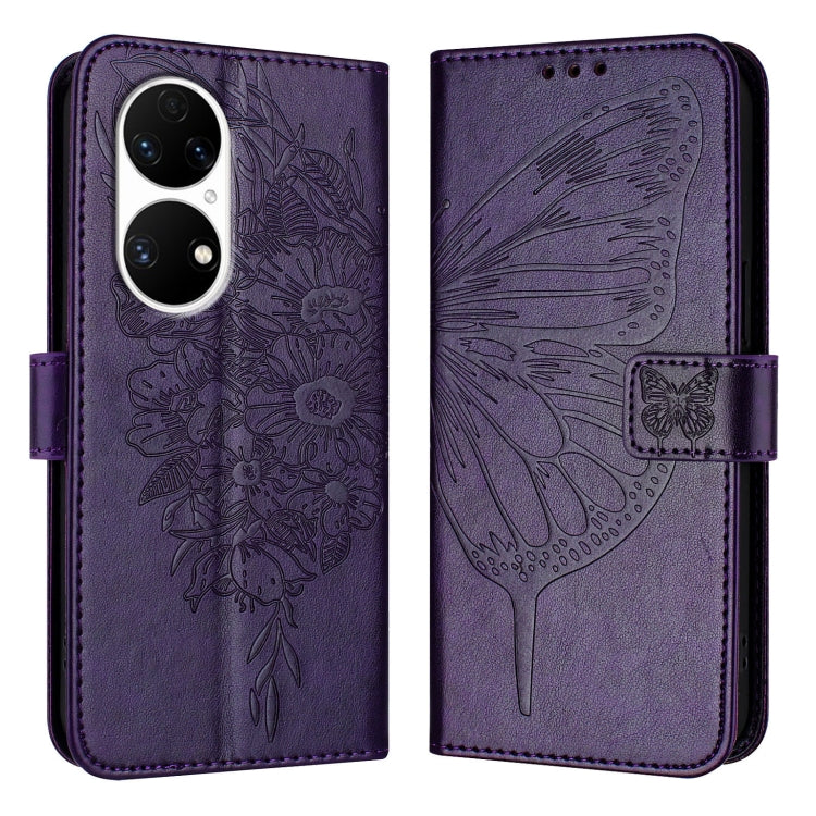 Funda de Cuero para Huawei P50 con Mariposa en Relieve (Púrpura Oscuro)