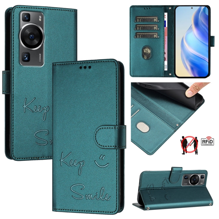 Funda de Cuero Rfid con Relieve Sonriente para Huawei P60/P60 Pro (Verde Pavo Real)