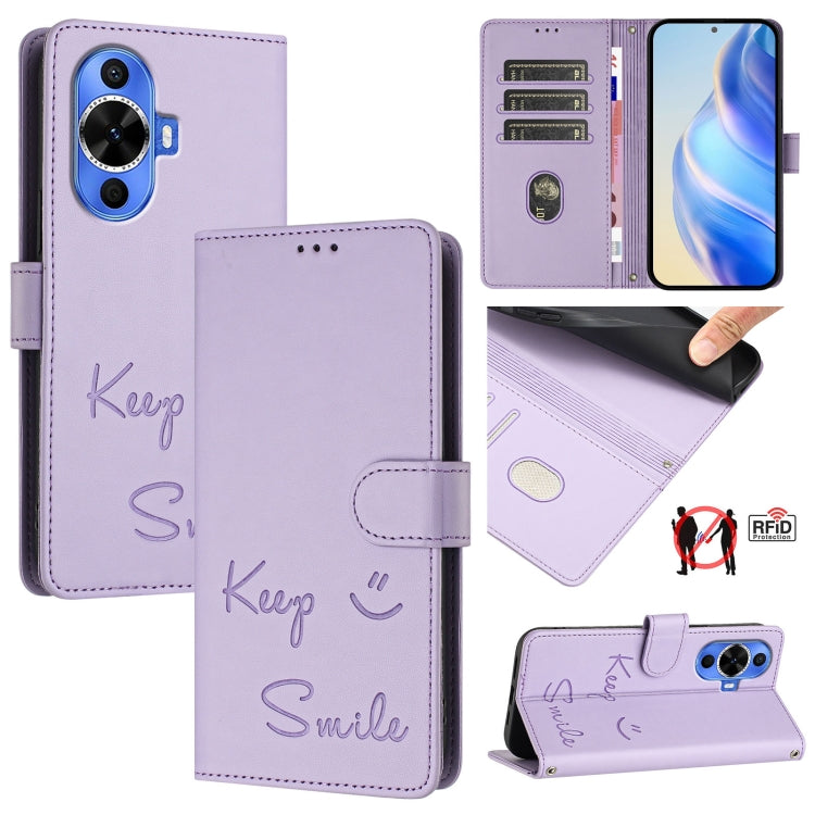 Funda de Cuero Rfid con Relieve Sonriente para Huawei Nova Y90 (Morado Claro)