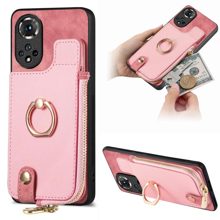 Funda para Teléfono Huawei Nova 9 con Cremallera Vertical y Anillo de Cuero Cruzado (Rosa)