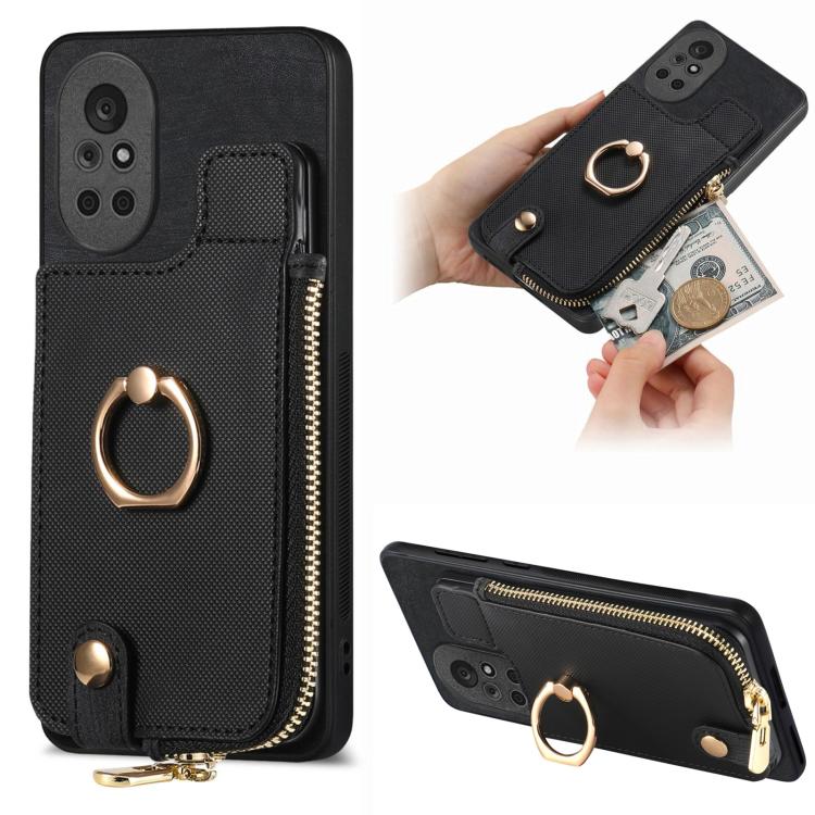 Funda para Teléfono Huawei Nova 8 con Cremallera Vertical y Anillo de Cuero Cruzado (Negro)