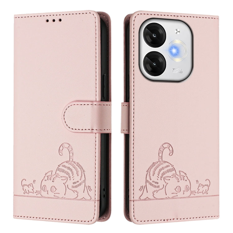 Funda de Cuero Rfid para Oukitel C57S con Estampado de Rata y Gato en Relieve y Cordón (Rosa)
