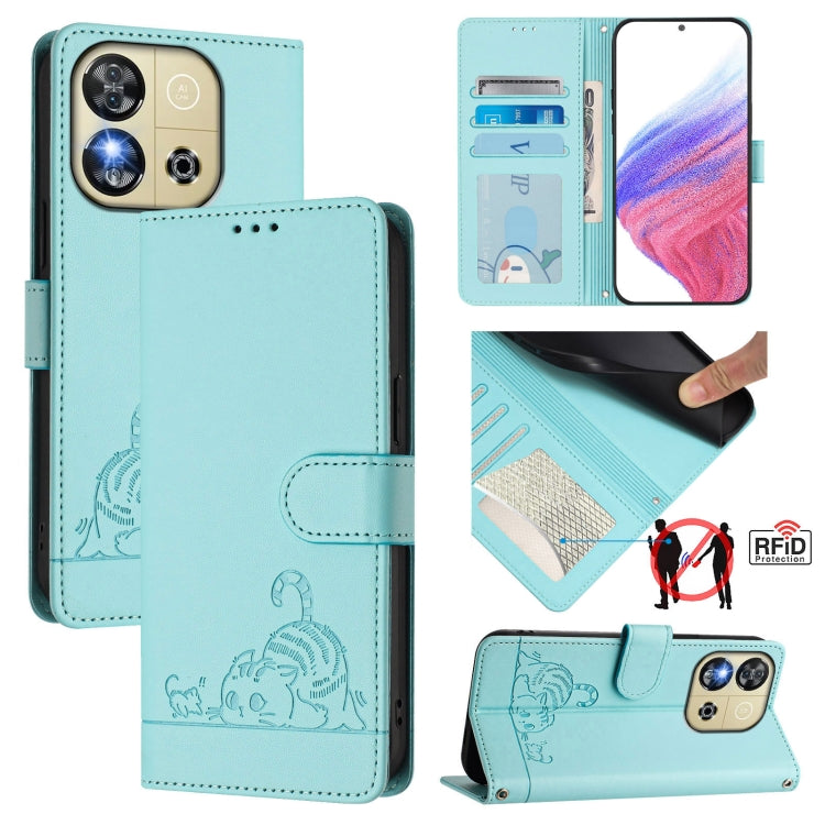 Funda de Cuero Rfid para Oukitel C57S con Estampado de Rata y Gato en Relieve y Cordón (Verde Menta)