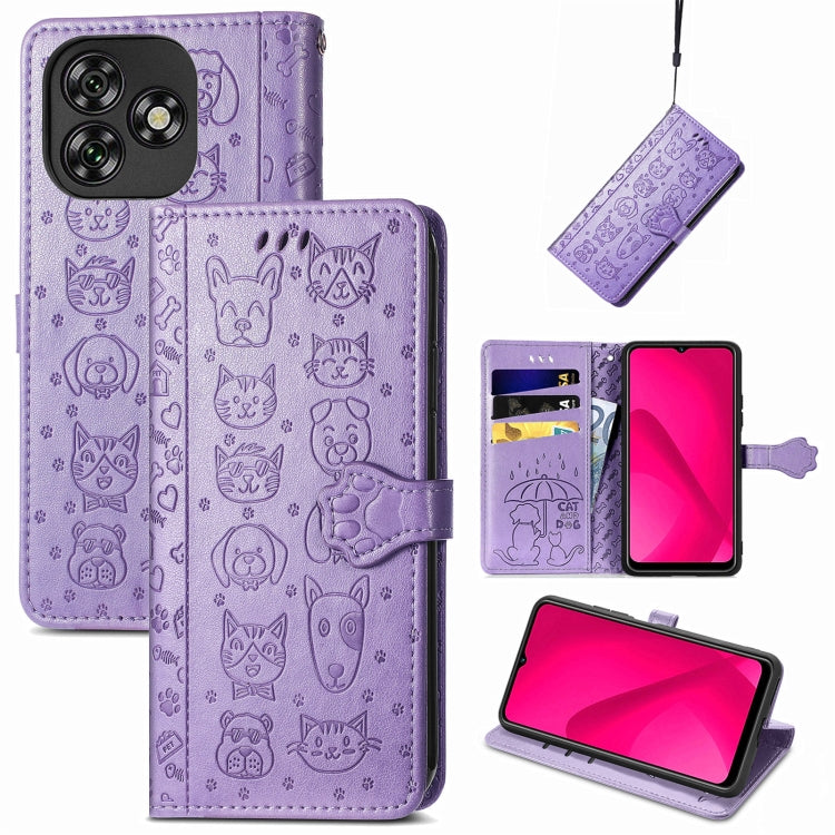 Funda de Piel con Relieve de Gato y Perro para Oukitel C53 (Morado)