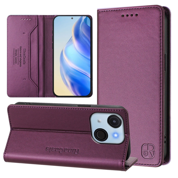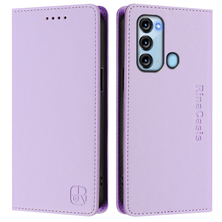 Funda de Cuero Rfid para Teléfono Itel P55 5G Rc01 con Succión Magnética y Doble Pliegue (Morado Claro)