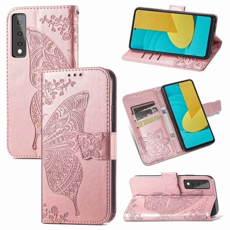 Funda de Cuero para LG Stylo 7 Butterfly Love Flowe con Soporte, Tarjeta Slot, Wallet y Lanyard (Oro Rosa)