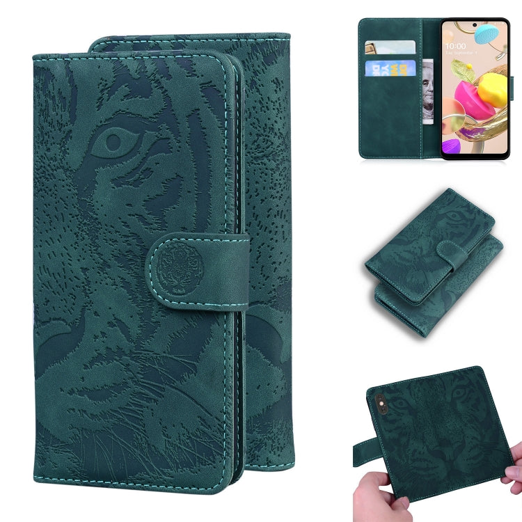 Funda de cuero con patrón Tiger para LG K42, tapa horizontal, tarjetero y billetera (Verde)