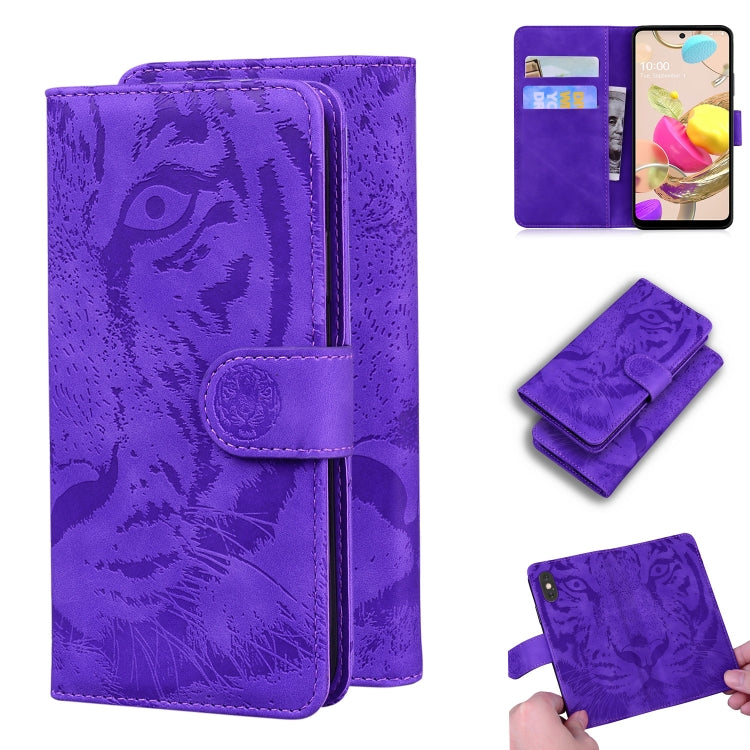 Funda de Cuero Horizontal para LG K42 con Estampado Tigre, Soporte, Ranuras y Billetera (Morado)