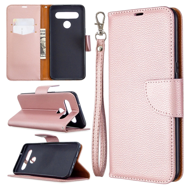 Funda de Cuero LG K61 Litchi Texture Horizontal Flip con Soporte, Ranuras y Cordón (Oro Rosa)
