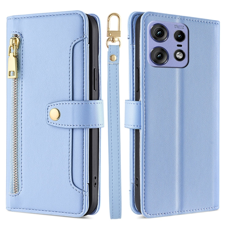 Funda de Cuero con Cremallera y Textura de Oveja para Motorola Edge 50 Pro 5G (Azul)