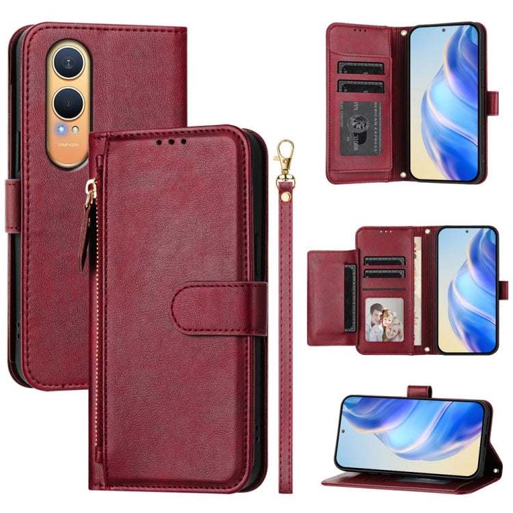 Funda de Cuero con Cremallera y Ranuras para Tarjetas para OnePlus Nord Ce4 Lite (Rojo Oscuro)