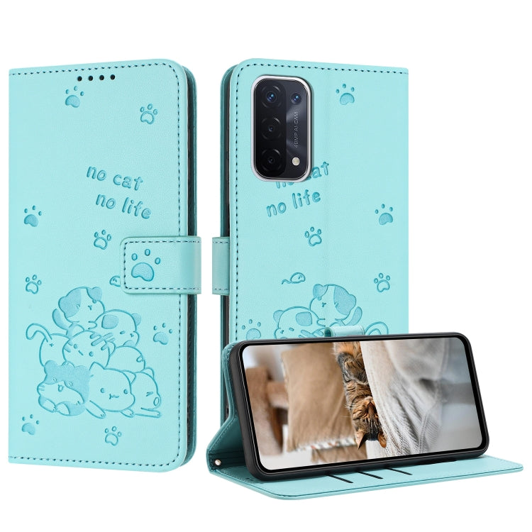 Funda de Cuero OnePlus Nord N200 5G con Diseño de Gatito en Relieve y Cordón (Verde Menta)