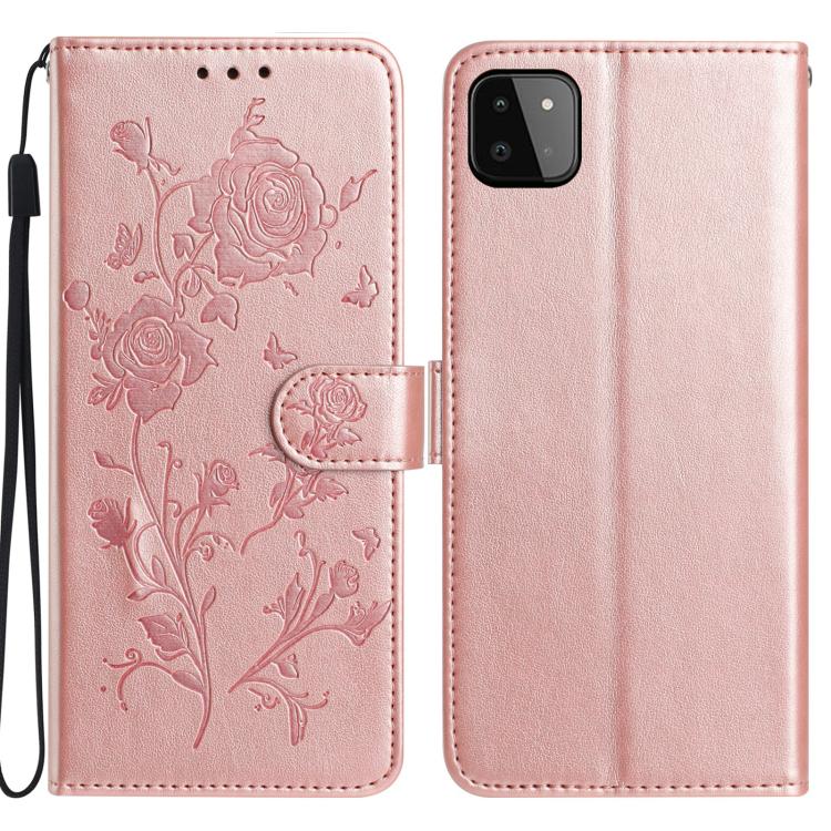 Funda de piel con estampado floral en relieve para Samsung Galaxy A22 5G (oro rosa)