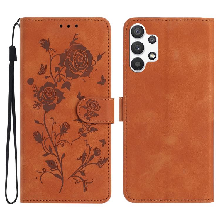 Funda de cuero con estampado de rosas en relieve para Samsung Galaxy A32 5G (marrón)