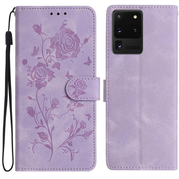 Funda de cuero con estampado de rosas en relieve para Samsung Galaxy S20 Ultra 5G (morado claro)