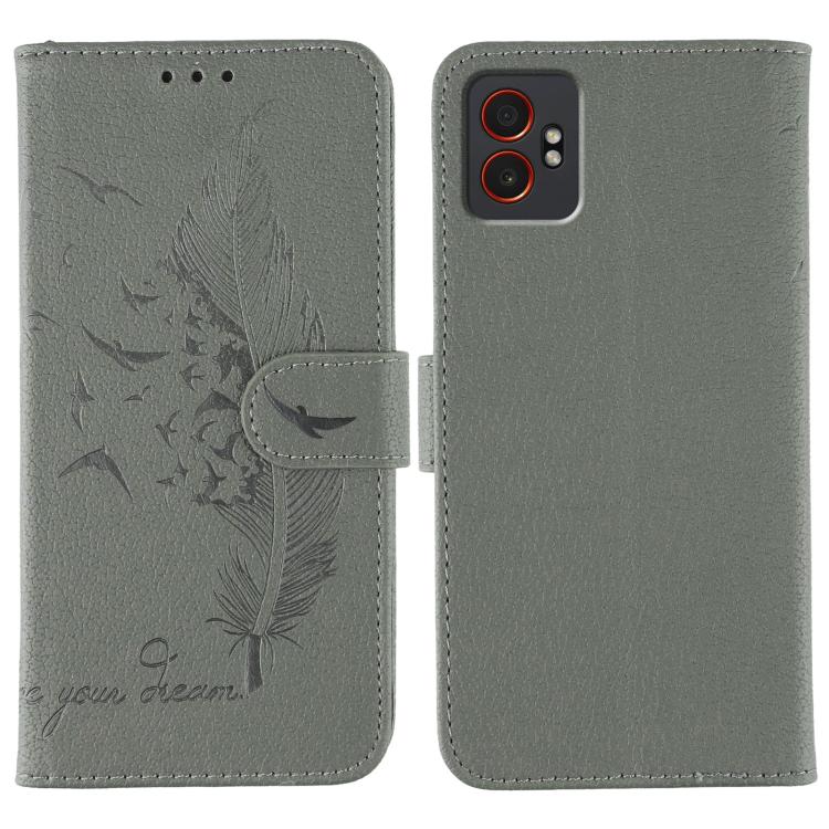 Funda de cuero con textura de lichi y estampado de plumas para Samsung Galaxy XCover7 Pro (gris)
