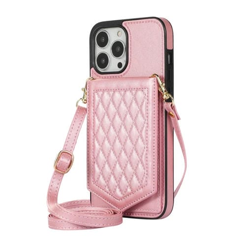Funda para iPhone 13 Pro Max Rhombic Texture Rfid con Lanyard y Espejo (Rose Gold)