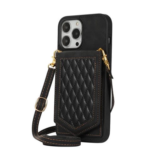 Funda para iPhone 13 Pro Max Rhombic Texture Rfid con Cordón y Espejo (Negro)