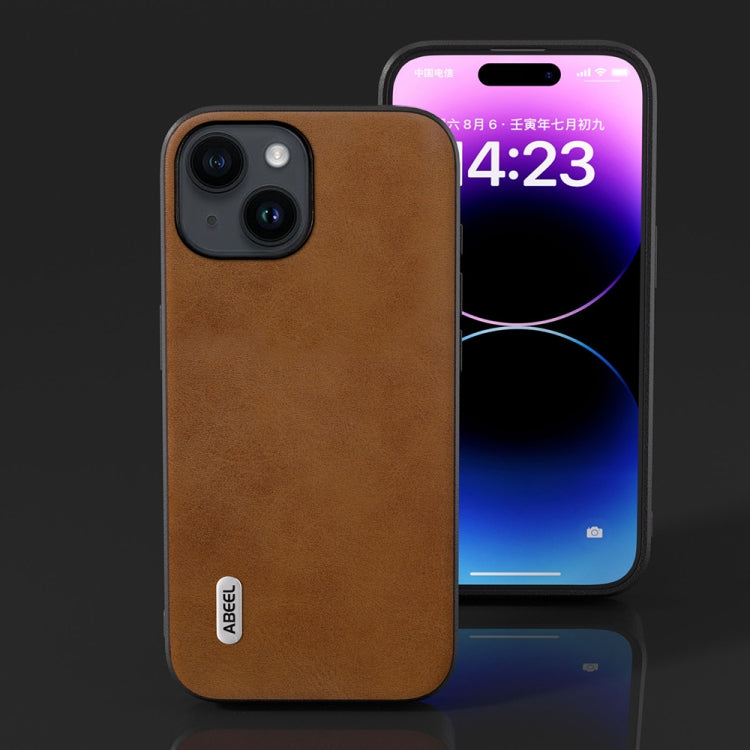 Funda de teléfono Abeel para iPhone 14 con textura de piel de vaca de doble color (Marrón)