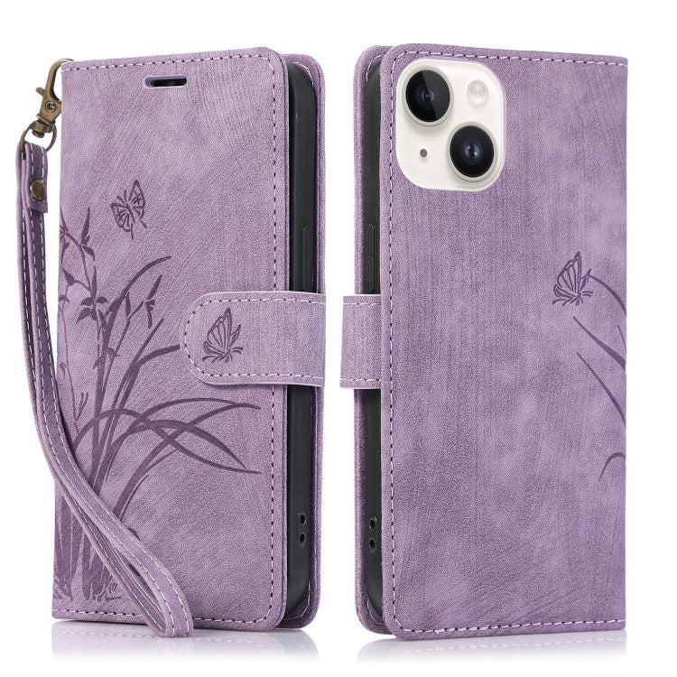 Funda para Teléfono iPhone 14 Cuero Relieve Mariposa Orquídea (Púrpura)