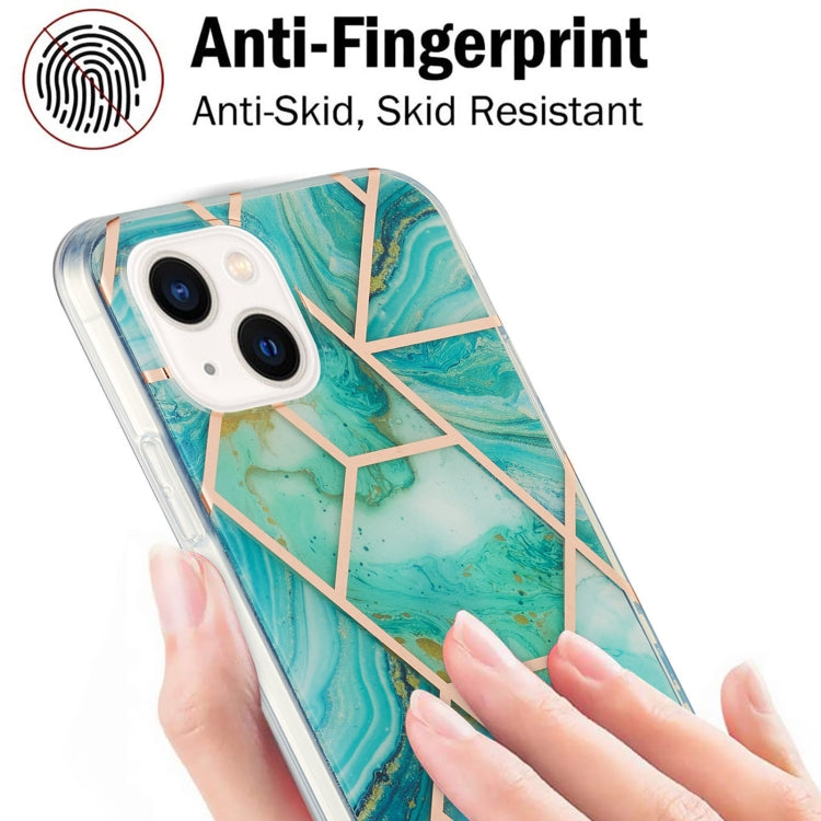 Estuche TPU para iPhone 15 Plus Galvanoplastia Empalme Mármol con Soporte y Patrón de Flores (Azul)