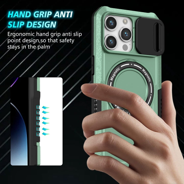 Funda para teléfono iPhone 15 Pro Max Sliding Camshield Magsafe Holder TPU Hybrid PC (Verde Oscuro)
