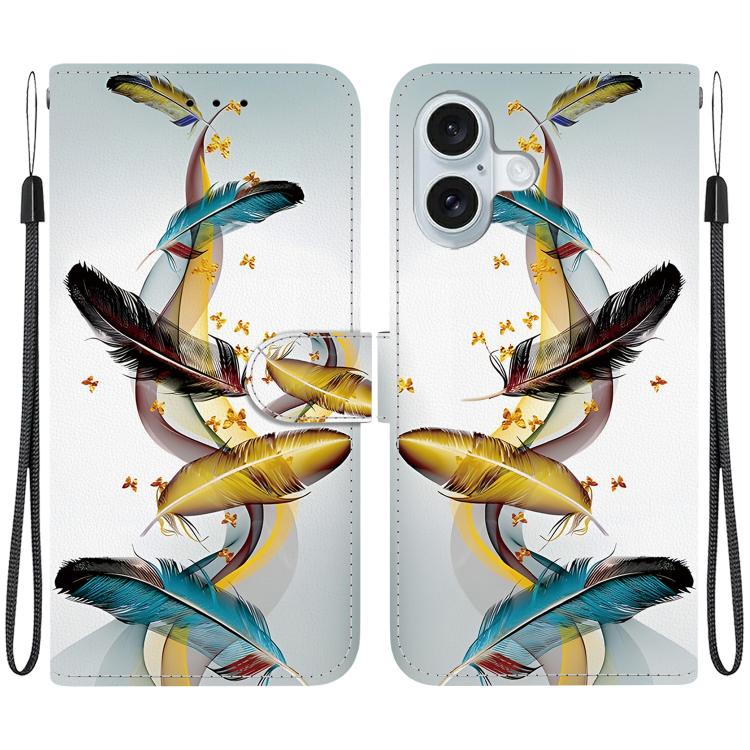 Funda de Cuero para iPhone 16 con Dibujo de Colores y Textura de Cristal (Plumas de Mariposa Doradas)