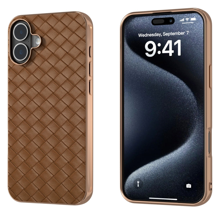 Funda de teléfono PU con textura tejida y marco galvanizado para iPhone 16 (Marrón)