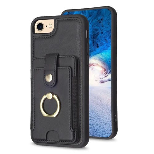 Funda para teléfono iPhone SE 2022/2020/8/7 parte Trasera cuero Litchi con tarjeta anillo (Negro)