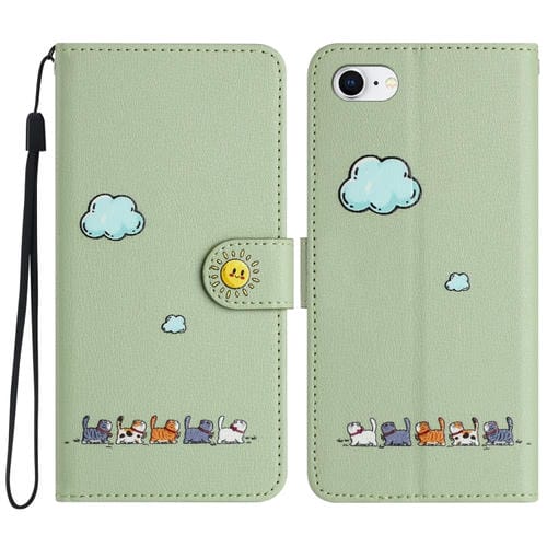 Funda de Cuero para iPhone SE 2022 y SE 2020 con Gatos de Dibujos Animados (Verde)