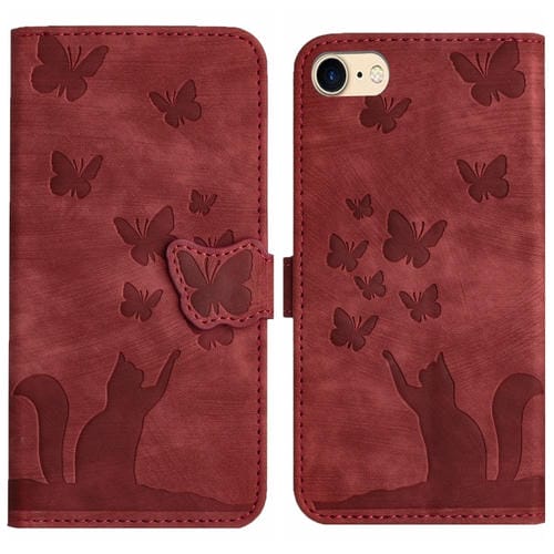 Funda para Teléfono iPhone SE 2022/2020/8/7 Cuero con Tapa Relieve Gato Mariposa (Rojo)