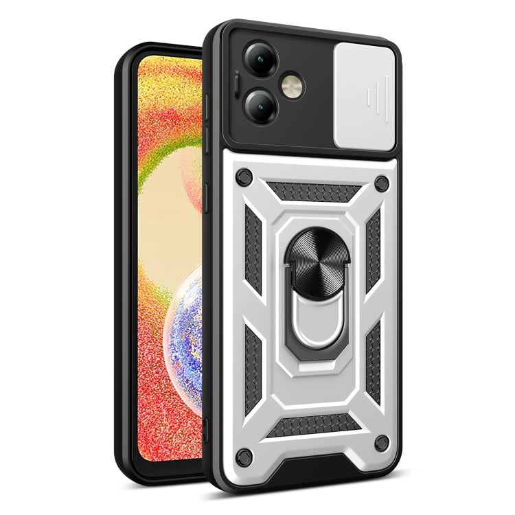 Estuche híbrido TPU y PC para Motorola Moto G14 con cubierta de cámara deslizante (Plata)