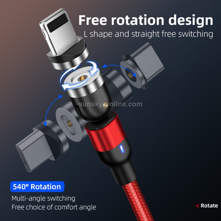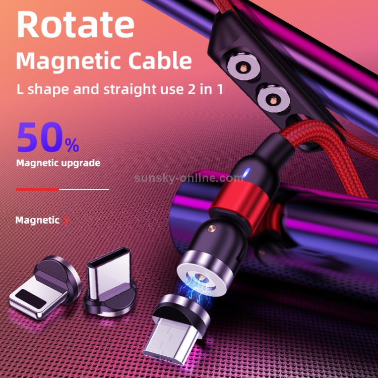Cable de carga 3 en 1 USB A 8 Pines + USB-C + Micro USB magnético giratorio trenzado de nailon (Negro) 2M 2A