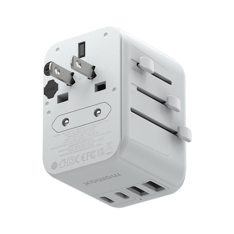 El Adaptador de Corriente Momax 1-World UA9 PD 35W es un Cargador rápido diseñado para ofrecer compatibilidad global en más de 200 países y regiones. Este dispositivo integra enchufes intercambiables para Estados Unidos, Australia, Reino Unido y Europa, facilitando su uso en Viajes internacionales. Su función principal es proporcionar una Carga eficiente y segura a través de múltiples Puertos USB, incluyendo USB-C con Soporte para protocolos avanzados como PD3.0, PD2.0, PPS y QC3.0. Su chip inteligente ajusta automáticamente la Corriente según el dispositivo conectado, permitiendo Cargar Teléfonos Móviles, Portátiles, tabletas y consolas de Juegos con un máximo de 35W de potencia. La Carcasa está fabricada en PC resistente a altas temperaturas y retardante de fuego, garantizando seguridad durante el uso. Además, cuenta con doble fusible para protección contra sobreCargas y un diseño compacto y ligero que facilita su transporte.