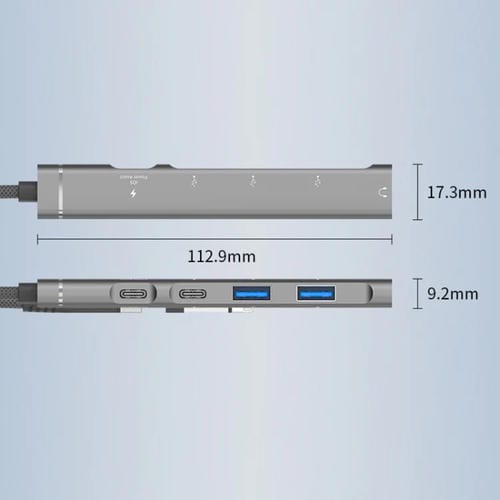 • Interfaz de entrada: Tipo C + 8 pines o Tipo C + USB-A (opcional); interfaz de salida: 1 Puerto de Carga Tipo C, 1 Puerto de datos Tipo C, 2 Puertos USB-A y Conector de audio de 3,5 mm; diseño ligero y Portátil; disipación de calor optimizada y transmisión estable