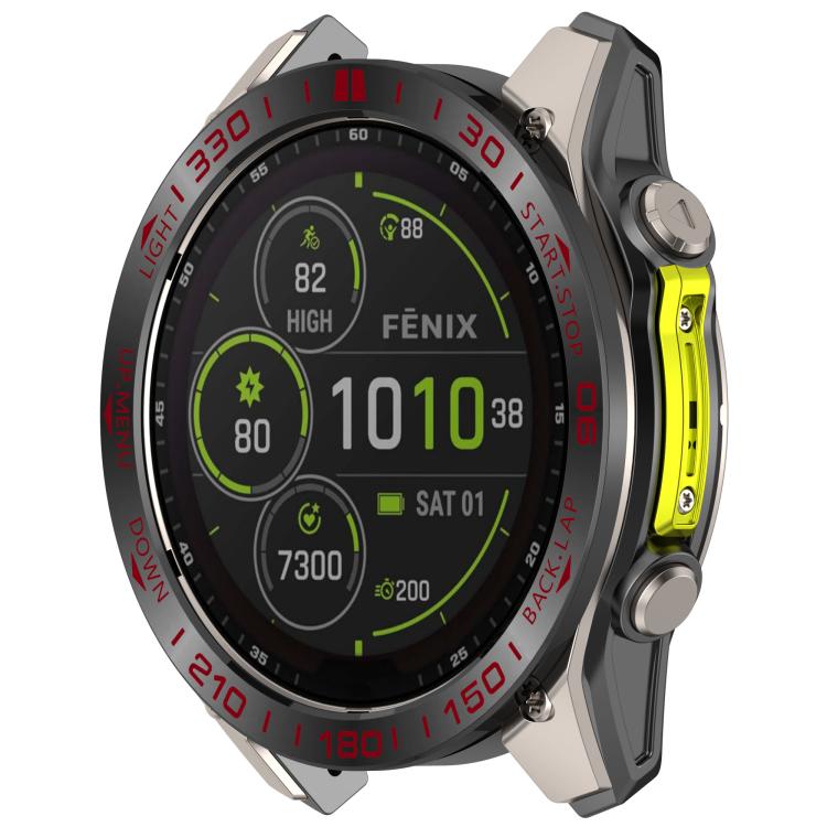 Anillo protector de acero inoxidable para reloj Garmin Tactix 8 Solar de 51 mm (estilo Compete Speed) (negro y rojo)