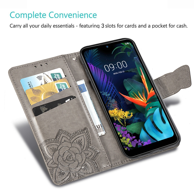 Funda de Cuero Butterfly Love Flowers para LG K50 con Tapa Horizontal, Soporte, Ranuras para Tarjetas, Billetera y Cordón (Rosa)
