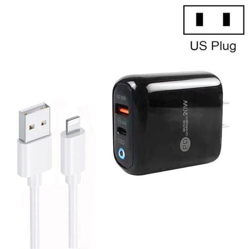 Cargador móvil Pd04 Type-C y USB con cable USB A 8 pines enchufe EE. UU. (Negro)