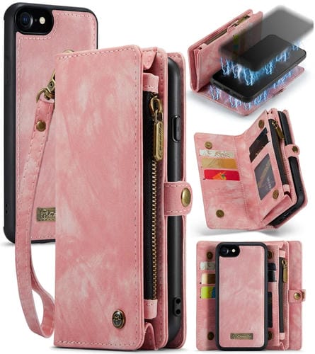 Billetera de cuero Caseme para iPhone 8 y 7 con funda Trasera PC magnética desmontable soporte 10 ranuras tarjetas 3 ranuras efectivo 2 marcos fotos 3 cierres (Rosa)