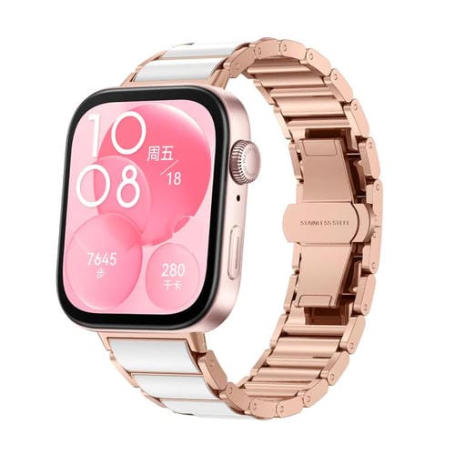 Correa de metal con hebilla de mariposa blanca de cerámica para Huawei Watch Fit 2 (oro rosa)